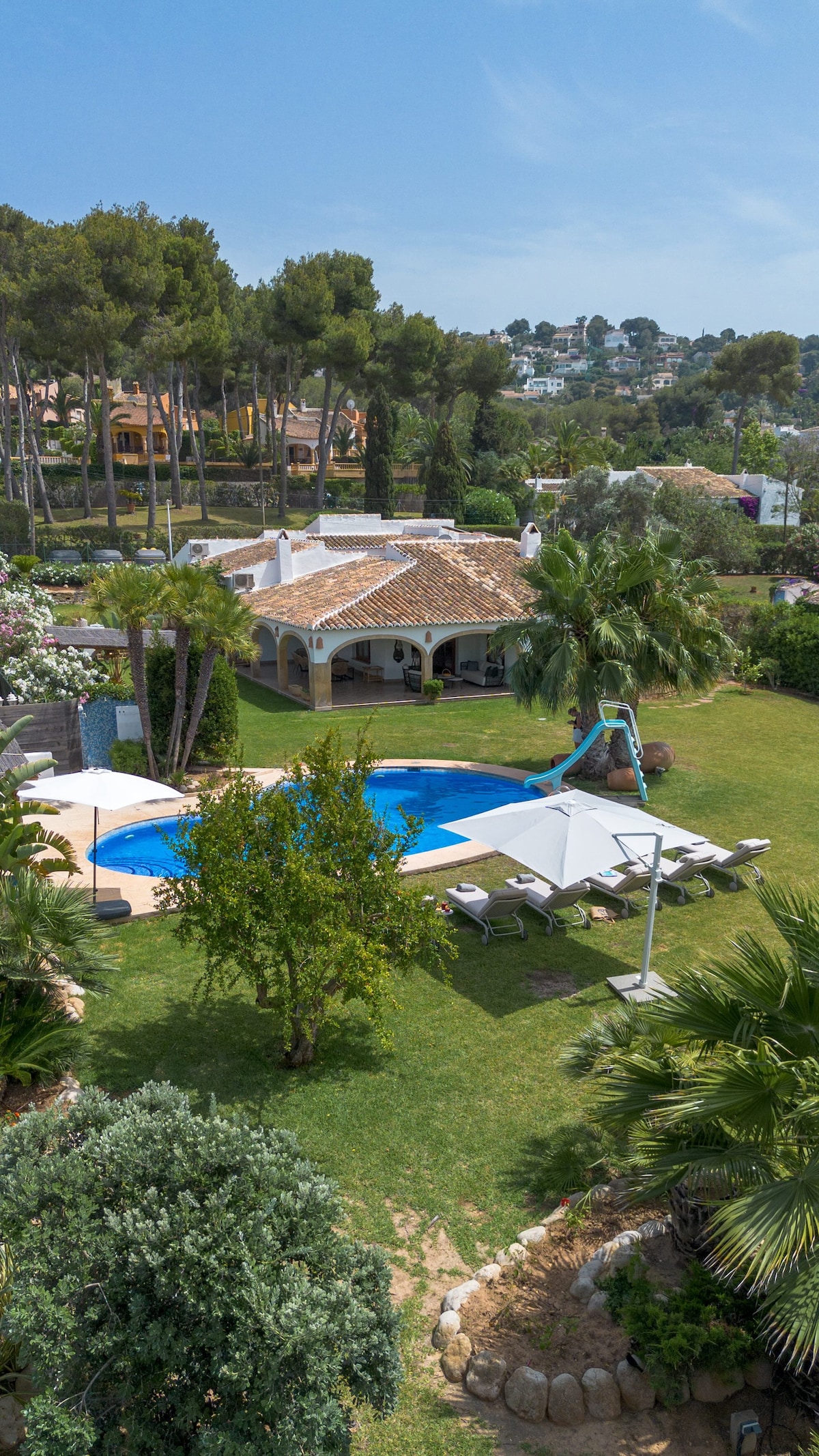 The large villa (700 m2) stands on mature private grounds (3000 m2) of lawns and established 30ft palms, the gardens are fully enclosed offering considerable privacy. It boasts a larger-than-average veranda making outside dining a real delight. The villa's elevated coastal position affords glimpses of the Mediterranean through the gardens' palms and pines. The extensive lawns and terraces accommodate a very large 12 x 6 meter pool with a diving board and integral steps from the Roman end.