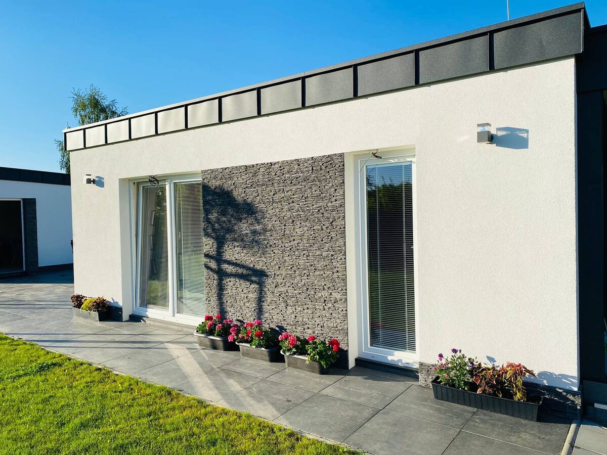 Modern house with a nice view. Eco friendly home which produces its own electricity. The house is situated in the back if our yard, separated by trees and garden from our family house, to maintain your privacy. The shower is only in the main house, but its not a problem to use it... :) We have a nice jacuzzi, which you can use anytime :) Moderny dom s peknym vyhladom situovany na konci zahrady. Ekologicky, produkujeme vlastnu elektriku, zberame dazdovu vodu, ohrev vody solarom.