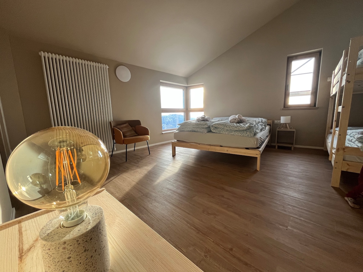 Einzellage inmitten unverbrauchter Natur. Im Dachgeschoss in Holzbauweise, ein großes Doppelbett, hoher Raumhöhe. Panoramablick übe das Tal. 1 Gratisparklatz, Hallenbadbenützung von nur vom 15. Juni - 5. Oktober im Preis inbegriffen. Ab Haus beginnen Wanderwege
