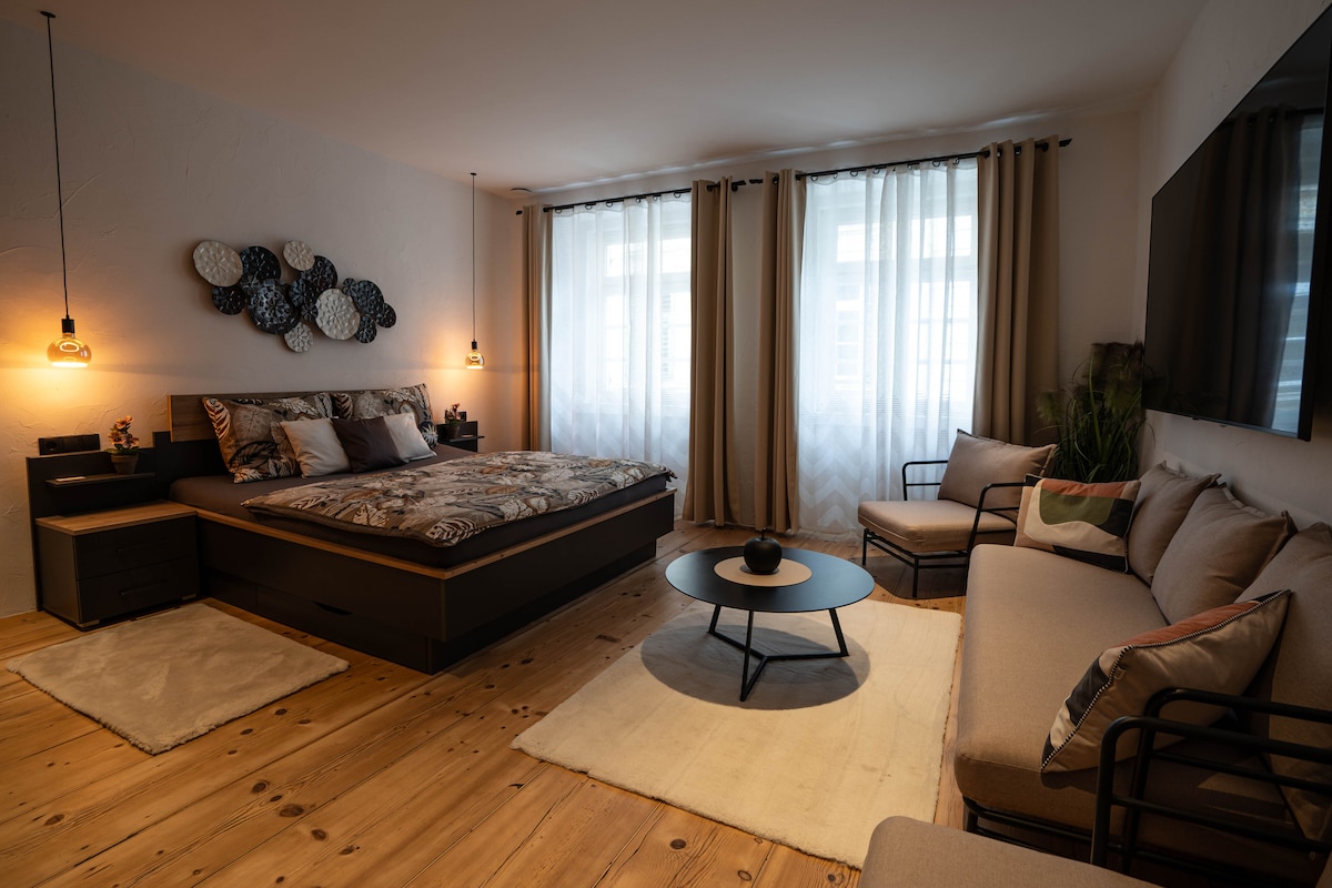 Studio with floor-to-ceiling windows, a modern kitchen, an open bathroom and a balcony with a view to the Dolomites. Studio with king-size bed / south-facing sunny balcony / floor-to-ceiling windows / sofa bed / HD LED TV / fully equipped branded kitchen / bathroom with walk-in rainshower / floor heating / high-speed WIFI / 40 m² / 1-2 persons. SPA: steam bath, Finnish sauna, bio sauna, cold-water pool, relaxation area, XXL infinity whirlpool, swimming pool. CrossFit Box – Gym.