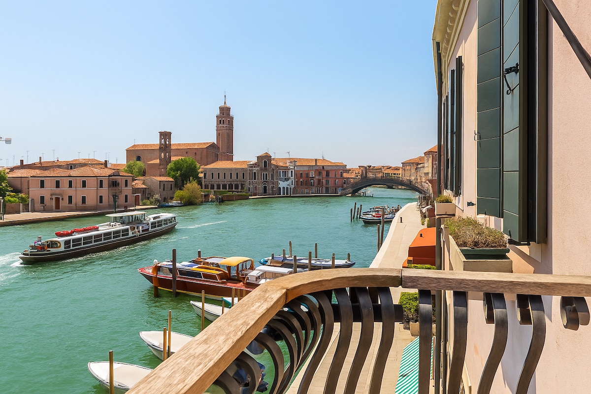 AMETISTA Suite is a 70sqm of show! Located on the second floor and overlooking the Grand Canal of the Murano island, 5 windows and a balcony, a real Suite with unique brightness and incredible view. Restored in 2017 with latest generation lights, independent heating, Wi-Fi and air conditioning, a splendid bathroom of engraved marble decorated by hand with gold and silver leaves, it is a simply idyllic property.