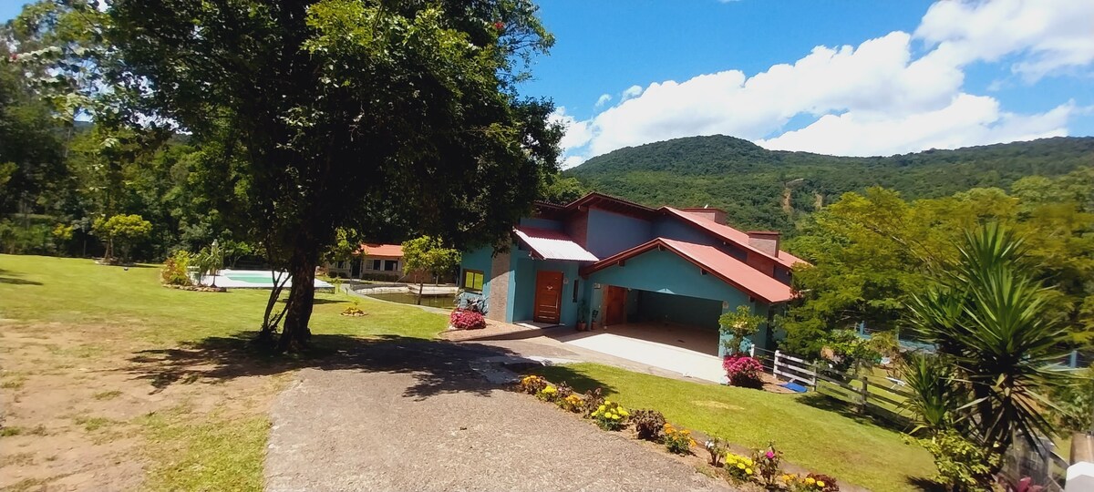 Local de fácil acesso em área rural, próximo ao centro budista, casa de dois pisos aconchegante, sacada com vista panorâmica da suite, visualização de animais silvestres e com animais domésticos na propriedade, ampla sala de jogos com lareira, garagem fechada para dois carros, cozinha ampla com churrasqueira, fogão campeiro a lenha com vista panorâmica para o vale, quiosque com churrasqueira e piscina, lago próximo ao portão de entrada local muito utilizado para fotografias.