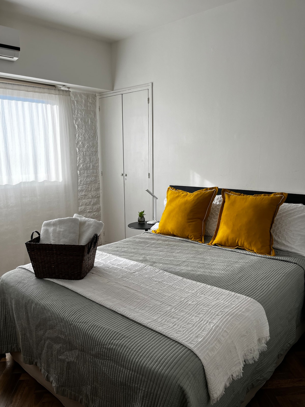 Luminoso monoambiente donde el cálido atardecer escapa por la ventana. Descansa en este tranquilo y hermoso departamento. Sábanas y toallas calidad hotelera, shampoo, acondicionador y jabon liquido para el cuerpo. Equipado con electrodomésticos, aire acondicionado, TV con cable y wifi, secador de pelo, luz de emergencia. A una cuadra del área de servicios con restaurantes, cafeterías, panadería p/ celiacos y veganos y transporte público.