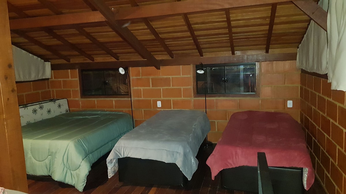 Relaxe e curta a natureza nesse lugar tranquilo, com sua família e amigos. Nossa acomodaçao possui, 2 quartos, 1 com suíte, e o outro com 2 camas de solteiro, no andar de cima, possui um quarto gigantesco que acomoda muitas pessoas com colchões pelo espaço, com um banheiro também. Possuimos uma piscina linda que pega sol o dia inteiro, churrasqueira, fogão a lenha, cadeiras e mesas para curtirem o espaço. Um lindo espaço, rústico, tranquilo e espaçoso para curtir com a família e amigos.