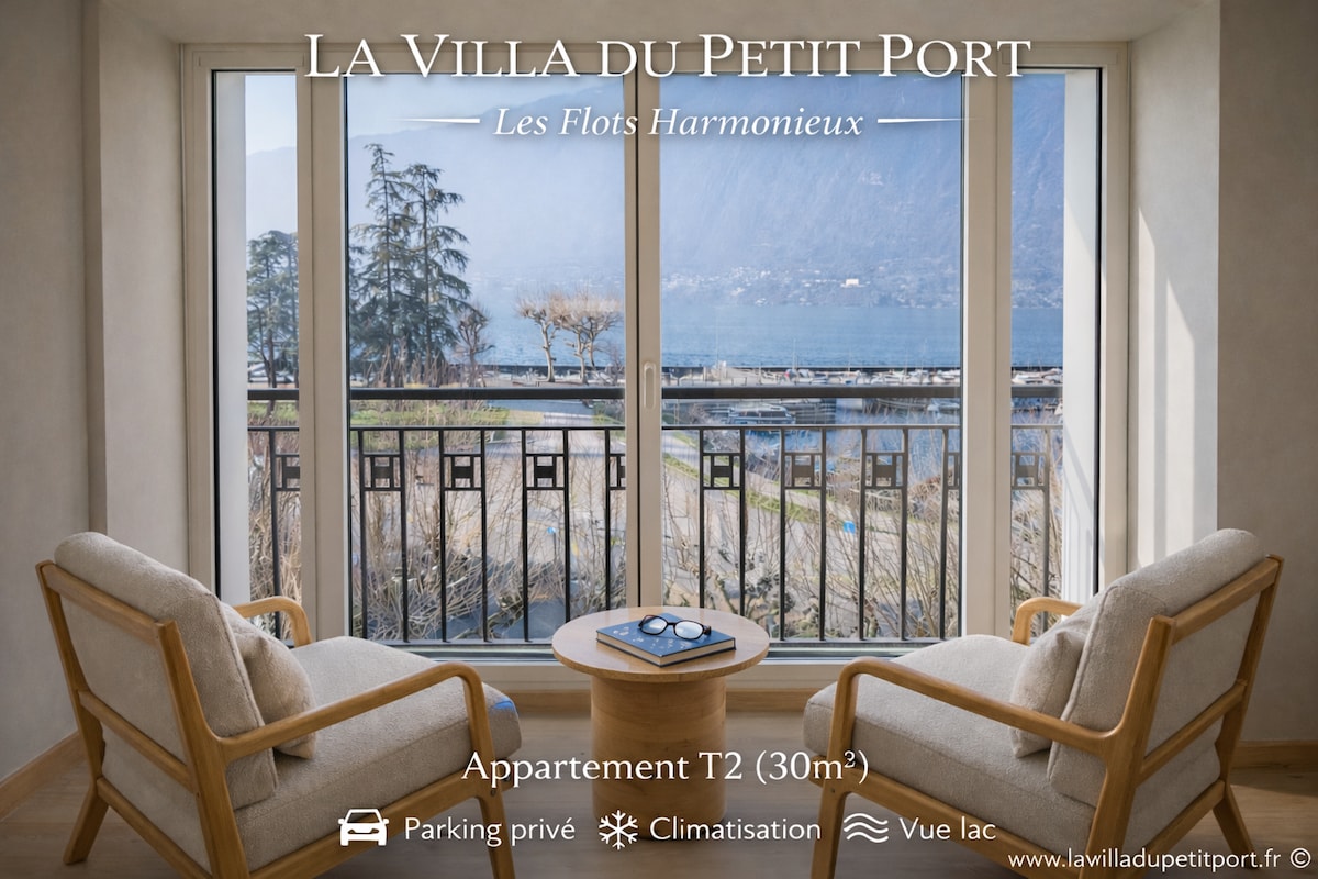 Cette suite de 35 m² possède une vue exceptionnelle sur le lac du Bourget. Une terrasse privative avec vue sur le petit port et Aix Les Bains rien que pour vous! La chambre est séparée de la pièce de vie. La plage est proche ainsi que de nombreux restaurants sont à proximité ainsi que des activités nautiques, locations de bateaux, piste cyclable. La cuisine est équipée, machine Nespresso. Place de parking privée, buanderie. WIFI. Les bébés et enfants de - de 12 ans ne sont pas acceptés.