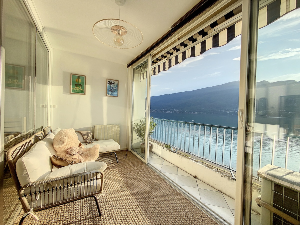 Appart 40m2 cosy ☕ avec vue incroyable sur le lac Revard Feclaz à 25 min en voiture🏔️ ❄️ Ski de fond /alpin ⛷️🏂, chiens de traineau, calèche, raquettes☃️⛄☃️ Bien être avec les Thermes ⛲🛀, spa. 🛑Linge de maison non fourni Ménage à faire en fin de séjour Option dispo sur demande 😊 lit suspendu 140x190 avec vue lac🌅 lit gigogne king size 160 x 200 lit 90 x 190 Parking gratuit 🚙 Resstaurants 🍨au pied de l'appart A 400m boulangerie🥛🥐, traiteur, ciné, casino, bowling, centre aquatique