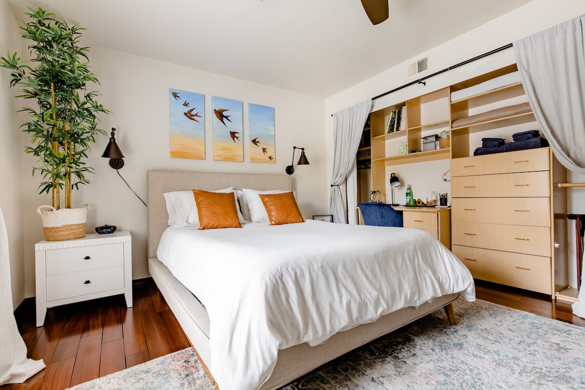 Completely Remodeled Studio THIS CONDO HAS NO ASSIGNED PARKING SPOT • Free bikes, boogie boards, beach gear, etc. • Quick walk to beach, pier, dining, trolley & shops • Soundproofed / Quiet • Desk & Office Chair • Redundant 300Mps Wi-Fi • Private balcony w/ BBQ • Cook’s kitchen • Keurig coffee w/ pods • Lux mattresses & bedding • Pet-friendly • Private entrance + keypad self check-in • Outdoor Shower • Mini split air conditioning • Washer+dryer