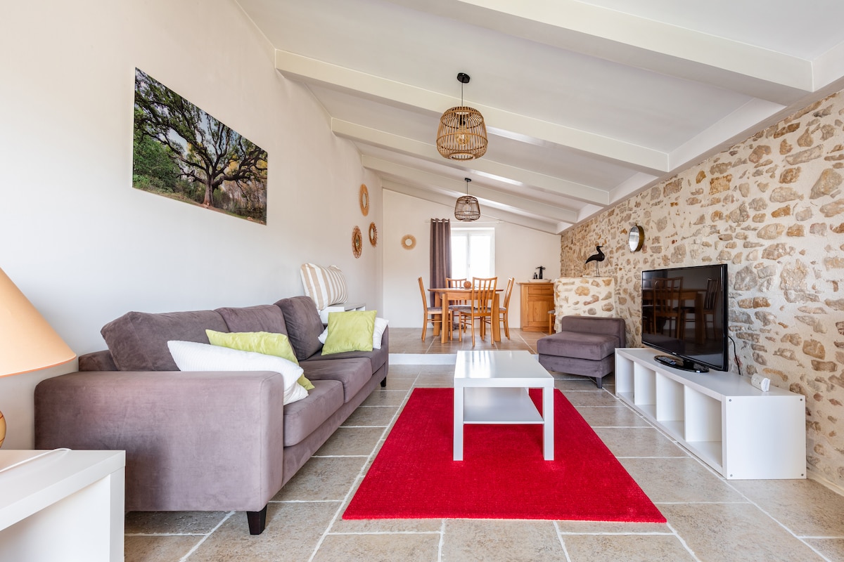 Trets est situé entre la Sainte Victoire et la Sainte Baume, à 20 mn d'Aix en Pce. A 40 mn : Marseille, Toulon et les plages Etage - 2 chambres avec lit double 140 - salle d’eau équipée d’une douche italienne - WC séparé RDC - cuisine équipée ouverte sur un séjour - WC séparé - terrasse sans vis à vis, - entrée privative - parking pour un véhicule Accès partagé à la piscine avec les propriétaires de 9h a 12h et de 14h à 19h Barbecue gaz partagé avec les propriétaires Ménage inclus