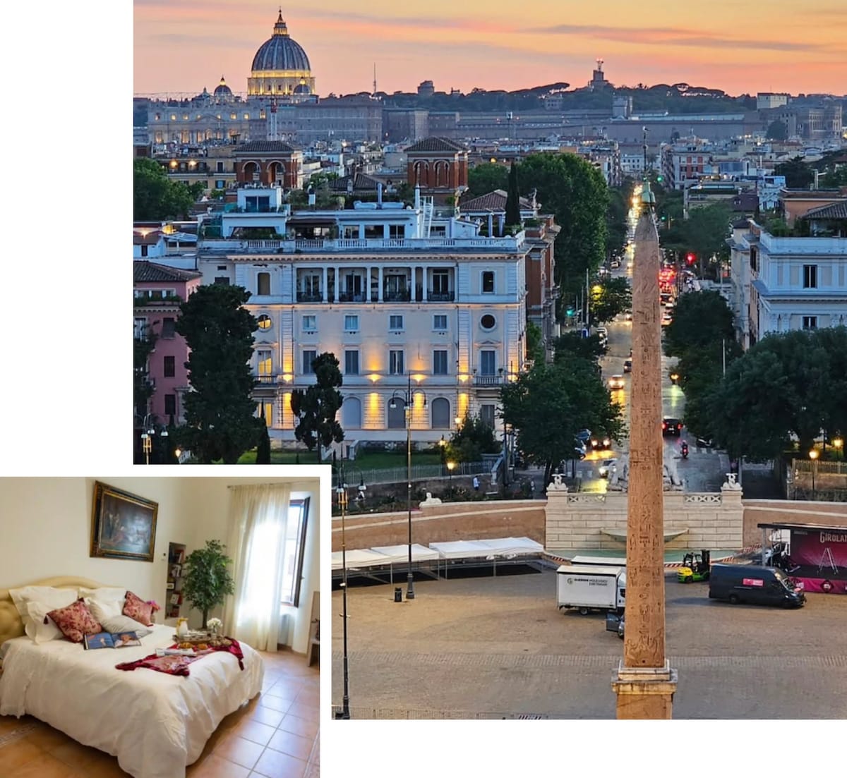 Breathtaking View over Rome City Center Skyline. This is the area of “The sweet life” & “Roman Holidays” movies 4 minutes walking distance by Spanish Steps, 6 minutes byTrevi Fauntain and 1 minute by Metro. Quiet and safe not far from bars & restaurants 2 large double bedrooms with a added bed each and 2 small showers. This Romantic apartment at the last floor (5th) with elevator, is furnished with ancient original forniture and parquet, providing the typical roman taste of decadent elegance