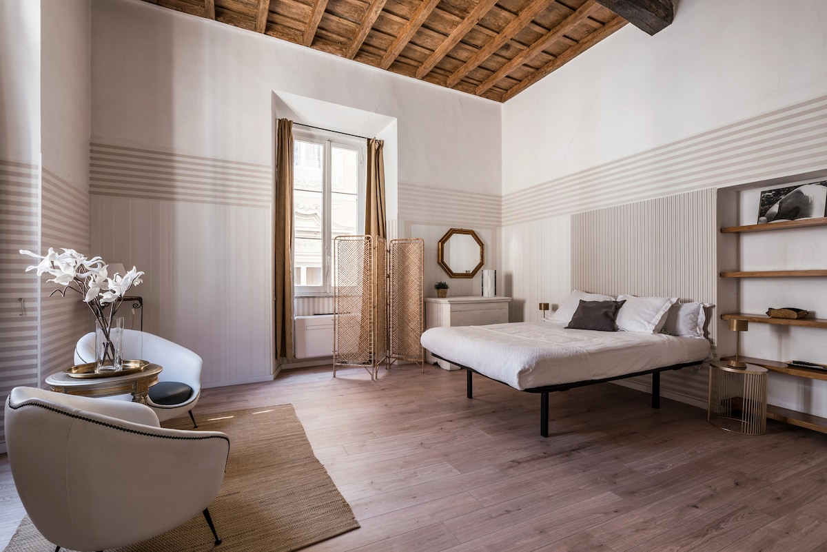 Attico finemente ristrutturato con vista Pantheon da dove godere nella quiete delle sue terrazze private, colazioni e drink serali. Arredato con alcuni iconici pezzi di design, ospita opere di un artista contemporaneo e una piccola biblioteca. Si sviluppa su due livelli: al primo, camera doppia, cameretta singola, bagno; al secondo: camera matrimoniale con bagno en suite, piccola cucina, salottino, due terrazze a livello. Wi-fi, climatizzazione, lavasciuga, lavastoviglie, forno, Smart TV