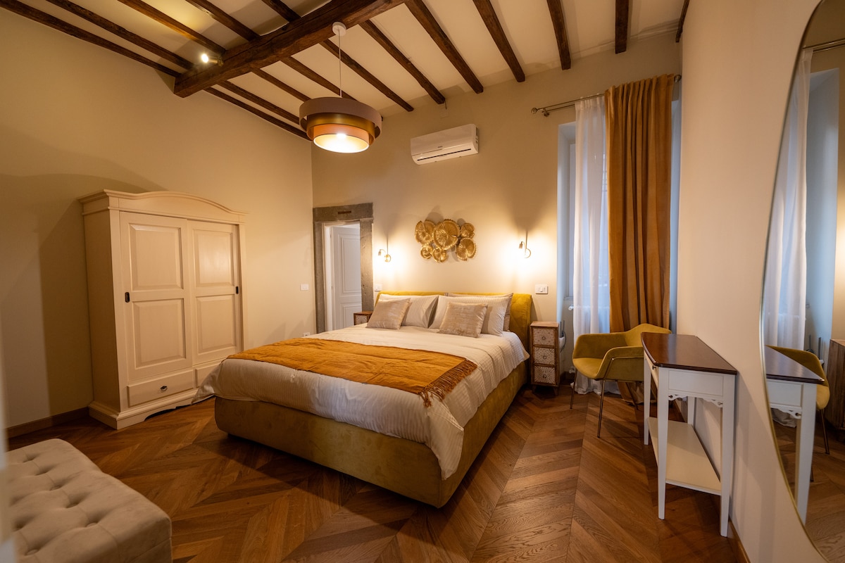 Appartamento al secondo piano di Palazzetto de Lante (senza ascensore con scale antiche in pietra strette e ripide, sconsigliate a persone con ridotta mobilità) con camera matrimoniale, area wellness con vasca romana e bagno turco. Bagno privato con doccia. Soggiorno con cucina completa, divano letto e piccolo bagno di servizio. La cucina è dotata di piastre a induzione, frigorifero, congelatore, forno tradizionale, forno a microonde e macchina Nespresso®.