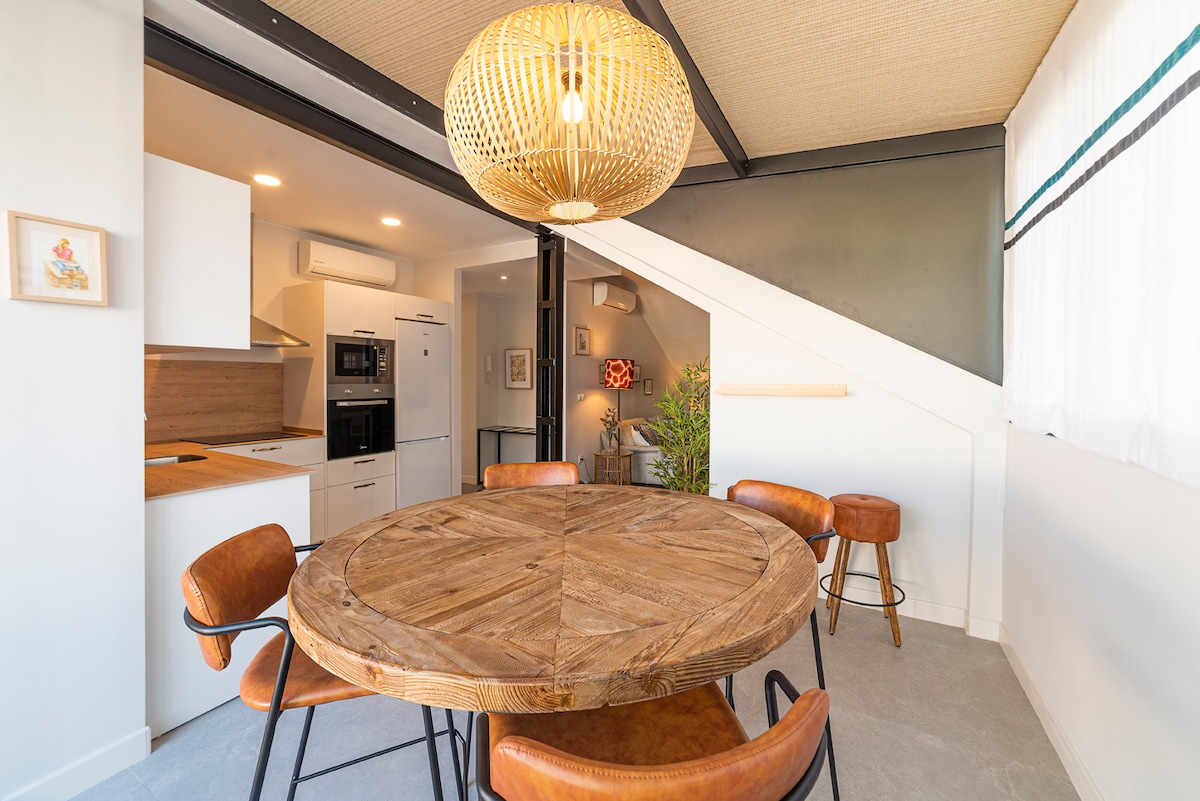 Bright, modern 55sqm loft in the middle of the historic harbor district Arenal, 3 minutes to the bullfightring and next to the river promenade. Cozy industrial design to feel good. High rooms, huge windows. No traffic / pub noise. Ideal for relaxing after city visit or working day. Only 3-10 min walking to the major attractions, cafes, restaurants, tapas, shops, nightlife Fully equipped kitchen, 2 bathrooms. 2 double beds, 1 sofa bed. Direct entrance without stairs. Newly renovated.