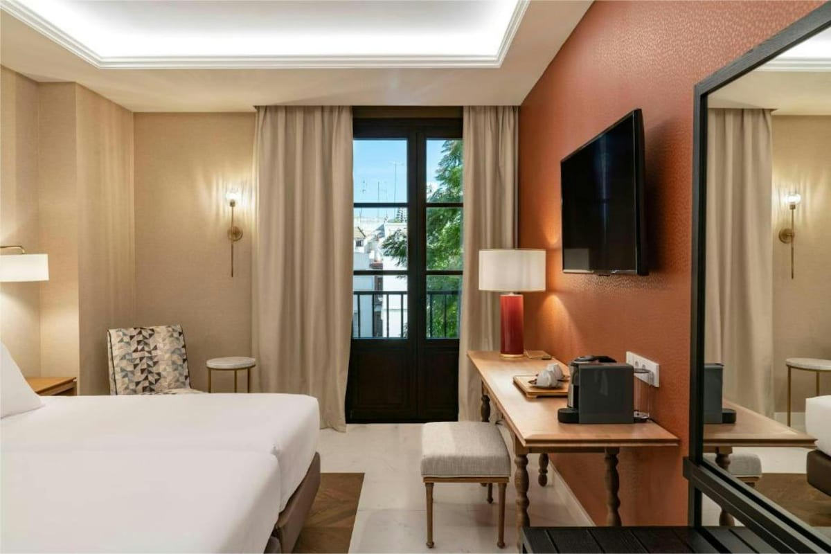 Welcome to the Catalonia Santa Justa! This recently renovated and refurbished hotel is located in Seville's Santa Justa district. It is only a 15-minute walk from the historic centre of Seville and the Giralda. Among the hotel's facilities, the interior courtyard of rooms with typical Andalusian decoration and the terrace with swimming pool and jacuzzi stand out. The premium rooms have music equipment with Bluetooth connection, among other special amenities. Their surface area is 22 m².