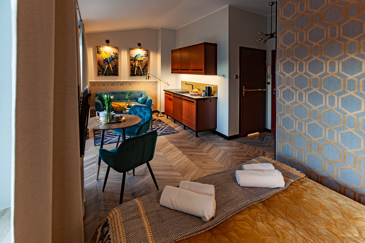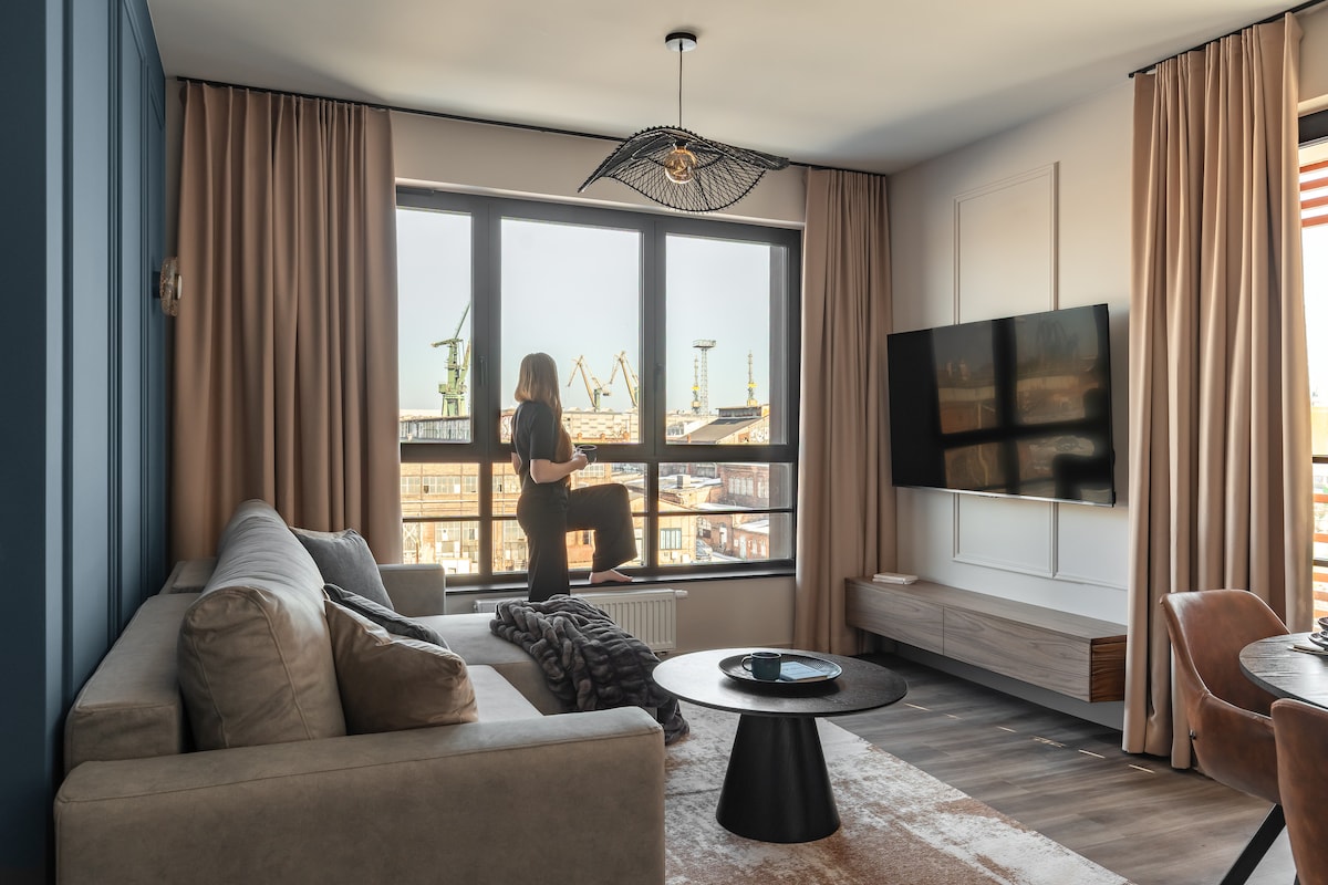 Romantic vibes and a designer freestanding bathtub are the highlights of this modern studio in Gdańsk. It’s the perfect spot for couples seeking both relaxation and style. The space combines a bedroom and living area in a minimalist, functional design. In the heart of Gdańsk, you'll find comfort, calm, and a touch of luxury—ideal for a romantic getaway or city break. On-site amenities include a gym, sauna, and rooftop terrace.