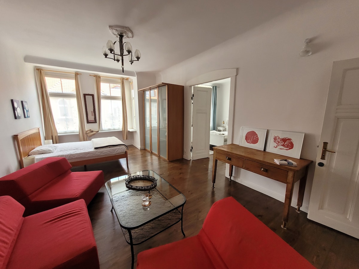 This is a unique (2 room) apartment located in the center of the Old Town, at the most prestigious street in Gdańsk - Długa Street. Also called the Royal Route. From the widows you can view Long Street, Neptune's Fountain, Long Market Square, Town Hall, Golden Gate. If you want something more than just a place to sleep i recommend this apartment. Its original interior design, mixing antique and modern elements in large space, will help you to experience Gdańsk's unforgettable charm.