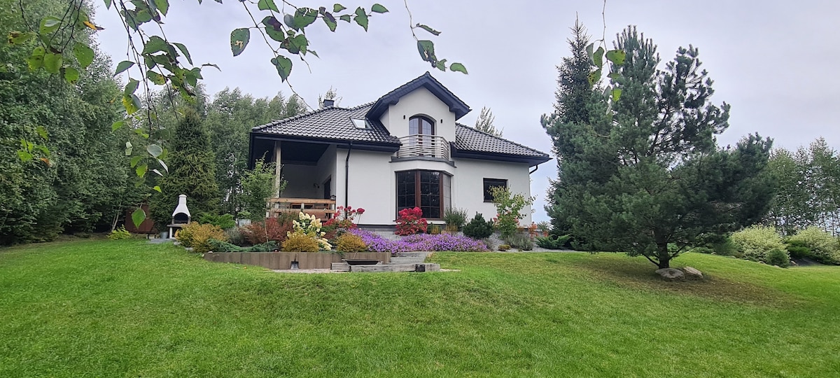 Dom u Marzycieli z widokiem na las, położony w sercu Kaszub, niezwykle wygodny i nowoczesny, a przy tym przytulny, w którym starannie dobrane meble i tkaniny pozwolą Ci się zrelaksować i odprężyć. Dom przyjazny dzieciom dzięki wyposażeniu w zabawki, książeczki, gry oraz w mini plac zabaw i trampolinę. Gości z pewnością zadowoli przestronny taras z leżakami, duży ogród, grill, palenisko, kominek. Najbliższa okolica obfituje w jeziora, lasy i zabytki architektury. Dom położony 30 km od Gdańska.
