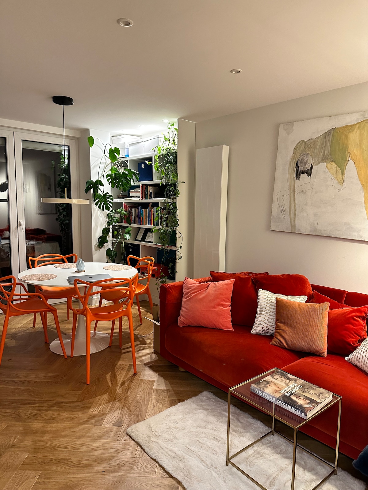 Apartament 3-pokojowy z dwoma sypialniami, dużą łazienką (dwie umywalki) i balkonem. Podwyższony standard wykończenia w stylu, nawiązującym do gdyńskiego modernizmu. Położony w spokojnej części Orłowa, w bliskim sąsiedztwie lasu i 900 m. od plaży. W pełni wyposażone i urządzony, także z myślą o dłuższych pobytach, wygodne biurko do pracy z szybkim internetem. Sauna i siłownia dostępne 24h. Cisza i spokój, okna i balkon wychodzą na piękny, duży ogród. Winda. 2 min. spacerem do stacji SKM Orłowo.