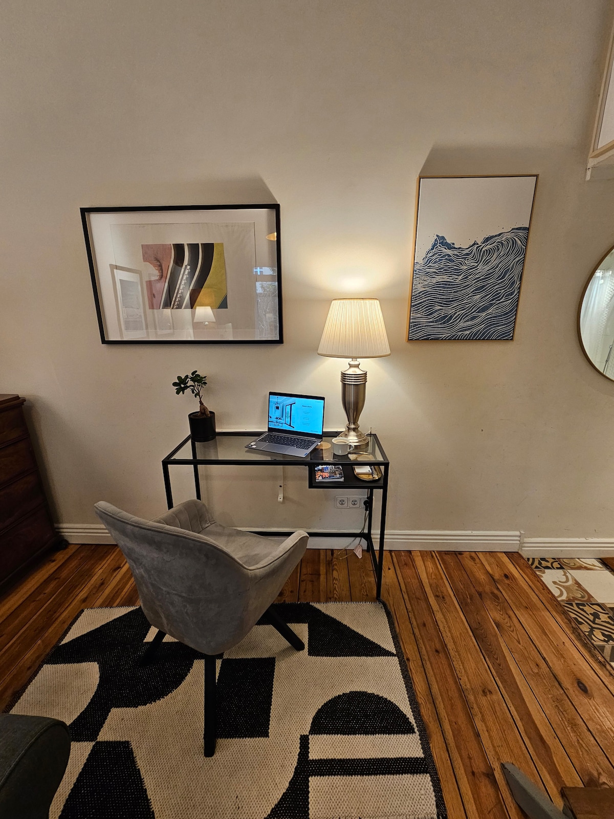 A unique apartment with a fireplace in the attic. We created this place just for ourselves, originally with paintings, books, a collection of cacti and handmade ceramics. We took care of comfort - 2 armchairs and a sofa, a fireplace and lots of pillows. There is also an equipped kitchen, a table with 4 chairs, a work desk and fast fiber-optic internet. Nearby there is a pizzeria, bar, shops, 5 min. walk to the Gdańsk Oliwa station.