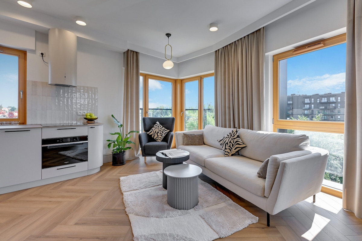 A freestanding bathtub, balcony, and stylish interiors — perfect for couples or families with children! This apartment features a bedroom and a sofa bed in the living room, comfortably sleeping up to 4 guests. On-site amenities include a gym, sauna, rooftop terrace, and playground. Located near Gdańsk’s Old Town and the Motława River — ideal for a romantic getaway or a family stay.