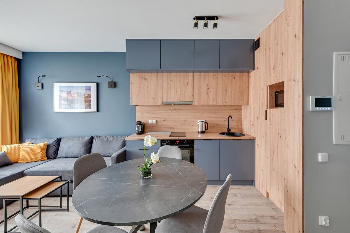 Romantic vibes and a designer freestanding bathtub are the highlights of this modern studio in Gdańsk. It’s the perfect spot for couples seeking both relaxation and style. The space combines a bedroom and living area in a minimalist, functional design. In the heart of Gdańsk, you'll find comfort, calm, and a touch of luxury—ideal for a romantic getaway or city break. On-site amenities include a gym, sauna, and rooftop terrace.