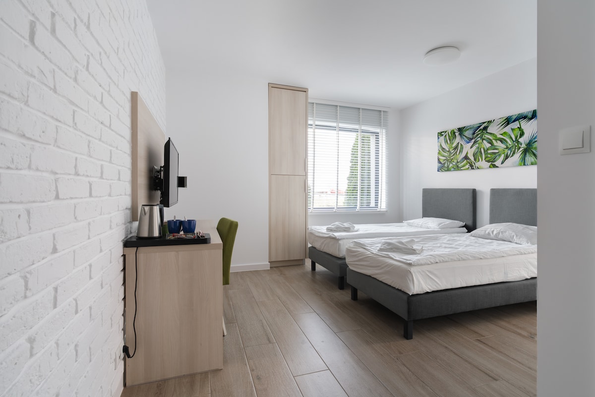 Apartament Studio City View to komfortowy i funkcjonalny pokój typu studio z przepięknym widokiem na panoramę Gdańskiego Starego Miasta. Wyjątkowy komfort i przyjemny wystrój pozostawią po sobie niezapomniane wrażenia.