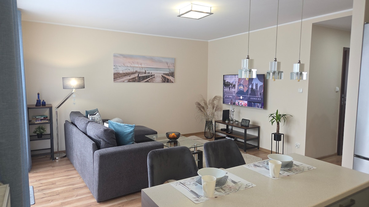 The well-designed interior (78m2) of the apartment provides great comfort. The space of the apartment offers a living area with a kitchenette, two bedrooms with comfortable and wide sleeping places, a bathroom with a shower, a separate toilet and a balcony. The apartment is fully equipped. On the balcony there is a seating set where you can relax and eat meals. The view from the balcony provides a beautiful panorama of Gdańsk.