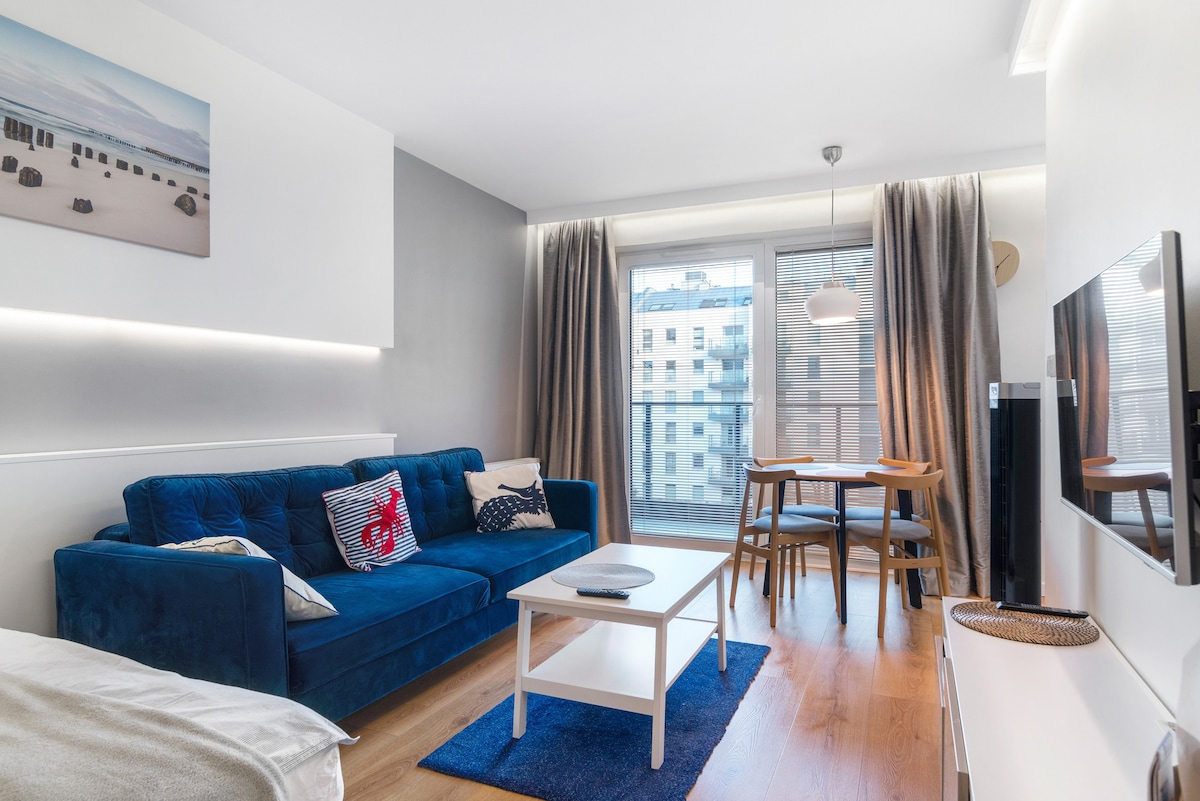 Modern and inviting space for up to 4 guests. With an open-plan layout, the studio seamlessly combines the bedroom, living area, and kitchenette. Enjoy the rooftop terrace, gym, coworking space and children’s playroom in the building. Walking distance: Old Town 10 minutes, Museum of the II World War 5 minutes, St. Mary's Church, Amber Sky Ferris Wheel, Gdanski Shipyard just a walk away! Choose the right place to stay in Gdansk!