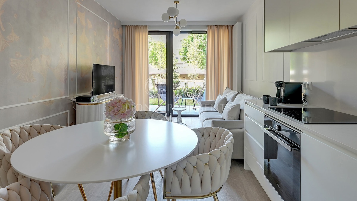 Nowy apartament urządzony w stylu jungle gotowy przyjąć do 2 gości. W niewielkiej przestrzeni wygospodarowano strefę sypialnianą z możliwością odseparowania za pomocą kotary, oraz strefę dzienną z rozkładaną sofą, w pełni wyposażonym aneksem kuchennym oraz łazienką. Apartament zlokalizowany jest na parterze nowego osiedla w bliskiej odległości od centrum. Do dyspozycji Gości jest ogródek ze strefą wypoczynkową w pełnym zieleni zaciszu.