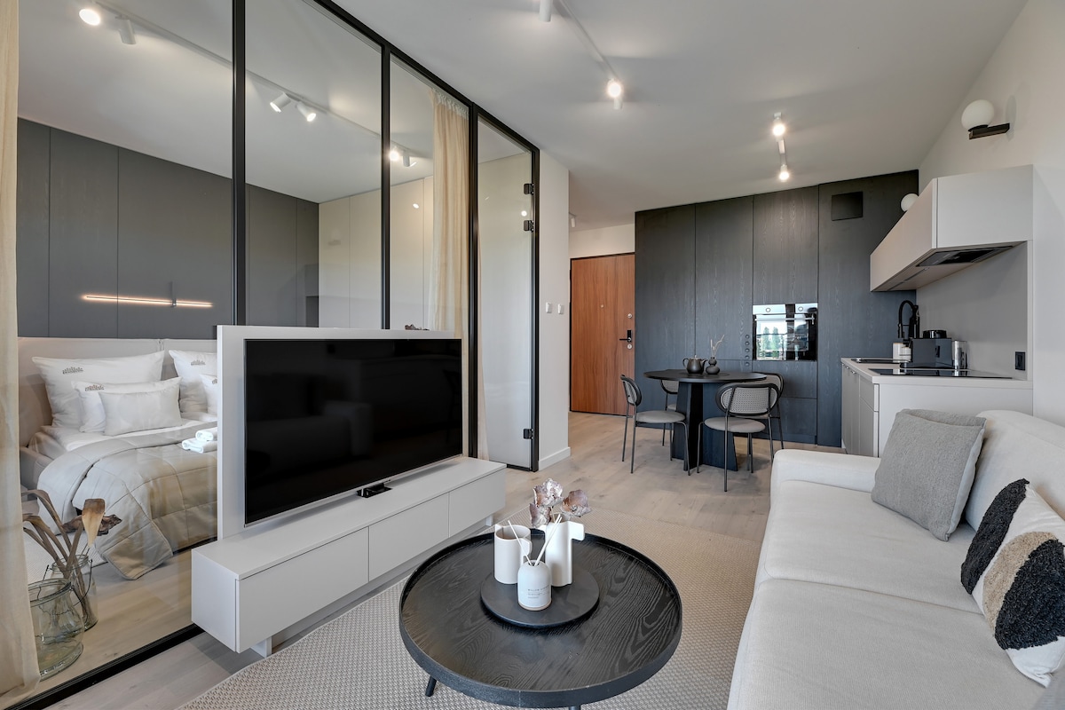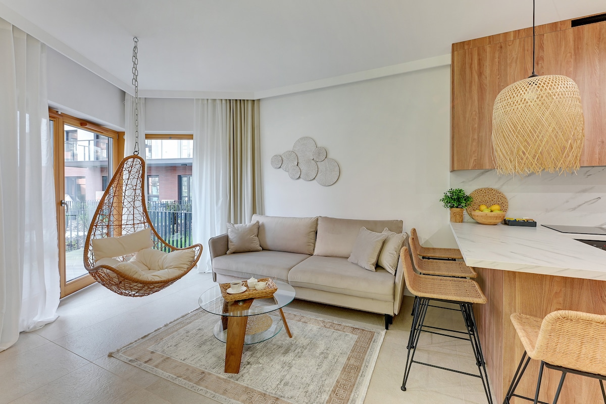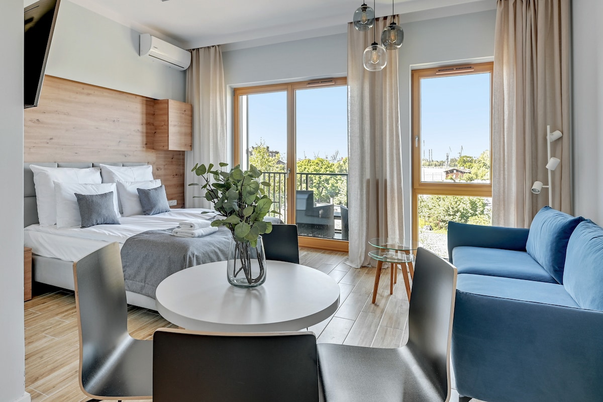 A freestanding bathtub, balcony, and stylish interiors — perfect for couples or families with children! This apartment features a bedroom and a sofa bed in the living room, comfortably sleeping up to 4 guests. On-site amenities include a gym, sauna, rooftop terrace, and playground. Located near Gdańsk’s Old Town and the Motława River — ideal for a romantic getaway or a family stay.