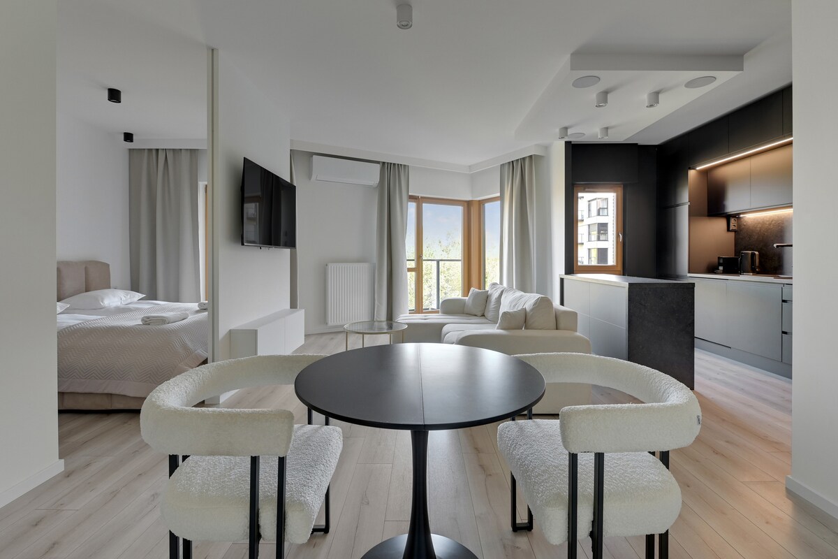 Romantic vibes and a designer freestanding bathtub are the highlights of this modern studio in Gdańsk. It’s the perfect spot for couples seeking both relaxation and style. The space combines a bedroom and living area in a minimalist, functional design. In the heart of Gdańsk, you'll find comfort, calm, and a touch of luxury—ideal for a romantic getaway or city break. On-site amenities include a gym, sauna, and rooftop terrace.
