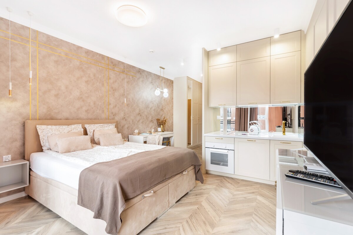 The apartment is situated in an old tenement house built around 1900. Lovely high ceilings add spaciousness to the rooms. The apartment has been recently refurbished and kept in a modern decor that gives nice, airy feel that helps to relax and wind down after a busy day. The state-of-the-art bathroom features double sinks, a spacious shower, and a roomy bathtub. The kitchen, which is open to the living room, is equipped with an induction cooker, microwave, and dishwasher.