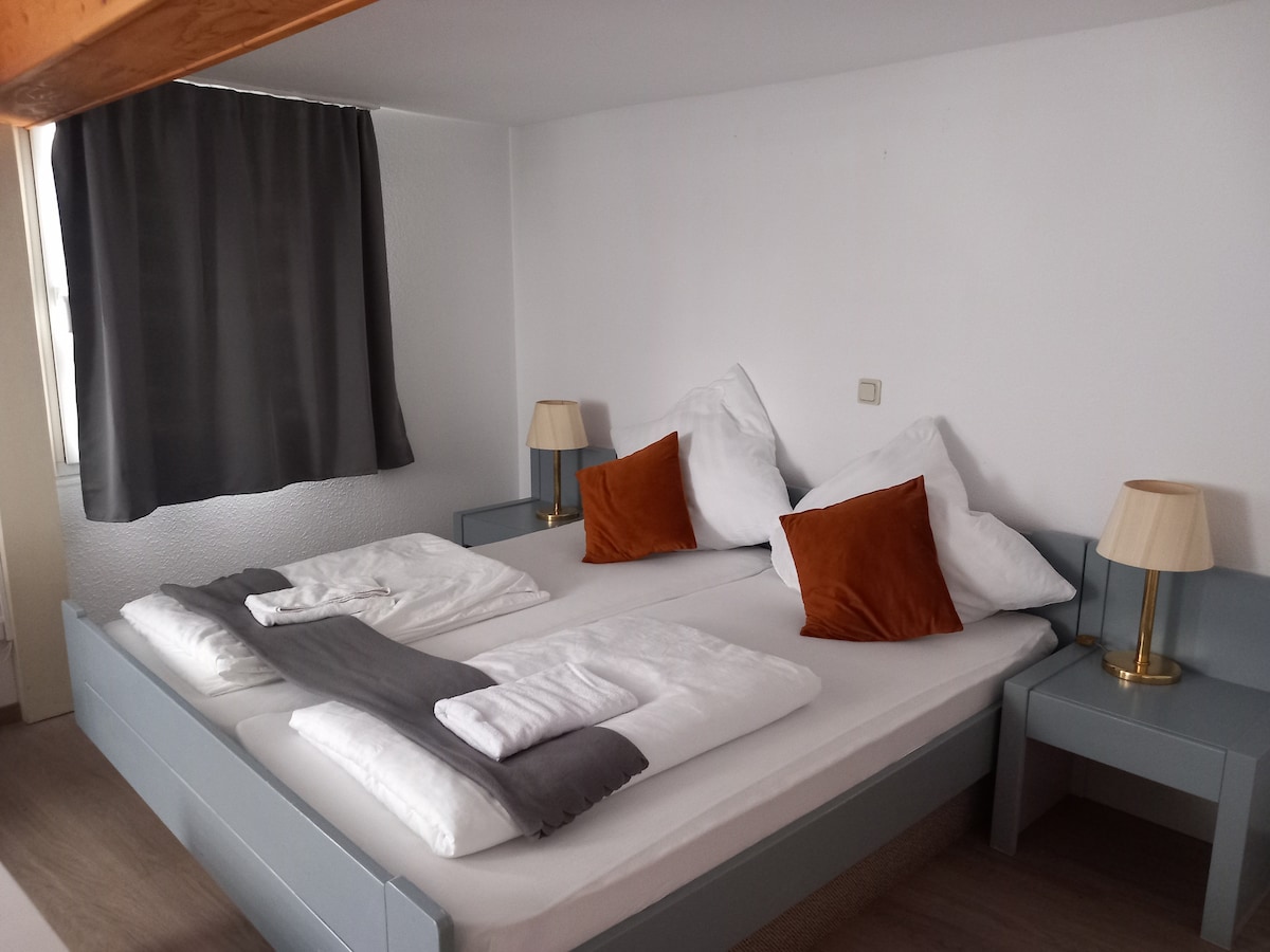 Our rooms can be used as single or double rooms. They are 20 square meters in size, have high-quality box-spring beds and two pillows per person. All double rooms have a bathroom with shower/WC and a balcony, which invites you to linger with a glass of wine, especially in the evening. In the double rooms, a welcome coffee or tea is available for you to make yourself in the coffee kitchen. Breakfast is not included in the price, but can be booked separately for 15 Euros/person .