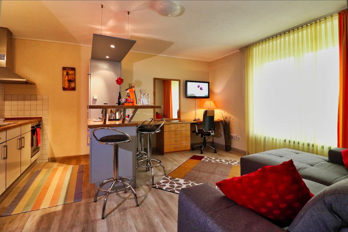 This is NOT a hotel. Room 3 is a double room with a queen bed and features a private bathroom with toilet and shower. You have a smart TV, free WIFI, mini fridge with small freezer, microwave and a water kettle. The room is only 5 minutes to Ramstein Air Base. There are stores and restaurants within walking distance and easy access to public transportation. Self-check in.