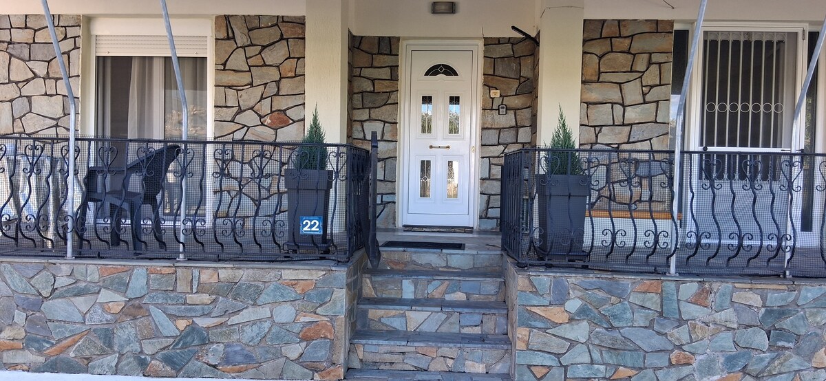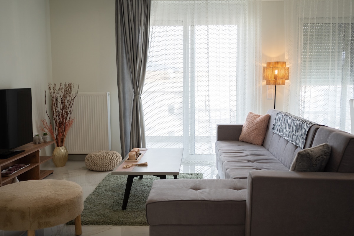 This stylish and sunny apartment of 100m2 is situated in the Old town of Kalampaka. It is located in a beautiful scenery surrounded by trees with a breathtaking terrace view of the famous Rocks of Meteora!By staying here you have great access to Kalampaka's shopping area (restaurants, bakery shops,coffee shops, banks, post office etc.) as it is only 5 minutes away from the town's center. It is in a quiet neighbourhood convenient for reaching out the best spots of Kalampaka even exploring Meteora on foot! The key position, the professional cleaning and the elegant decoration makes it suitable for every guest.
