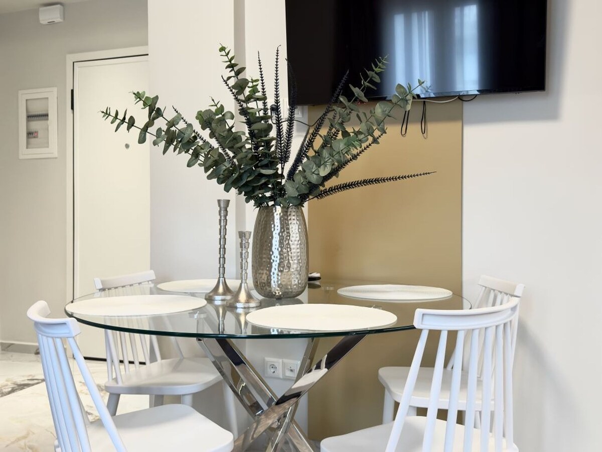 Unwind in a bright, thoughtfully designed apartment in Kalampaka, minutes from the Meteora monasteries. Spacious bedrooms with plush linens, a calm living room with TV, and a private balcony with seating provide a perfect retreat after your explorations. A dedicated desk and high-speed Wi-Fi support remote work, while soothing tones, wood floors, and natural light make the space fresh, modern, and welcoming from the moment you arrive.