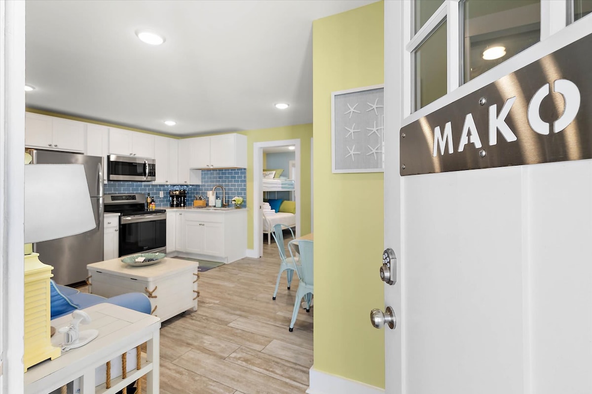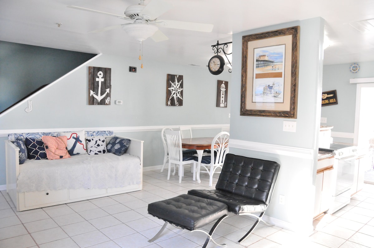 You've never seen waterfront like this. Welcome to Edgewater Escape, a luxury bayfront loft apartment that hangs entirely over the bay on 7th street in downtown Ocean City. Sit on the bay front porch or hang out inside and watch boats, dolphin, birds, and sometimes even seals swim by within feet of the porch. The loft has a roomy king sized bed and the downstairs couch pulls out into a comfy queen bed. Recently renovated, it comes fully equipped for your big trip or quiet staycation :)