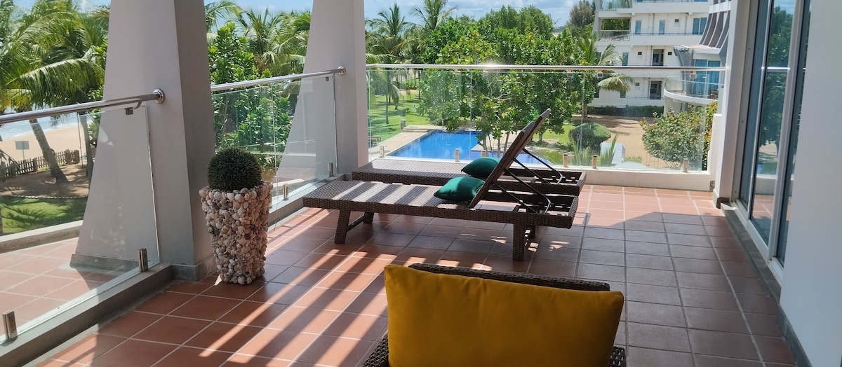 Experience living in this spacious 120sqm single level 3BR, 2BA, full-kitchen condo with a balcony offering a stunning 180° view of the garden, pool, and the beautiful Indian Ocean. This beachfront condo is perfect for families or groups of friends, located in a quiet village just 15km away from downtown, offering peace and privacy. The gated compound 24-hour surveillance and parking. Don't miss out on this incredible opportunity to enjoy a luxurious stay in paradise. Book your stay now!