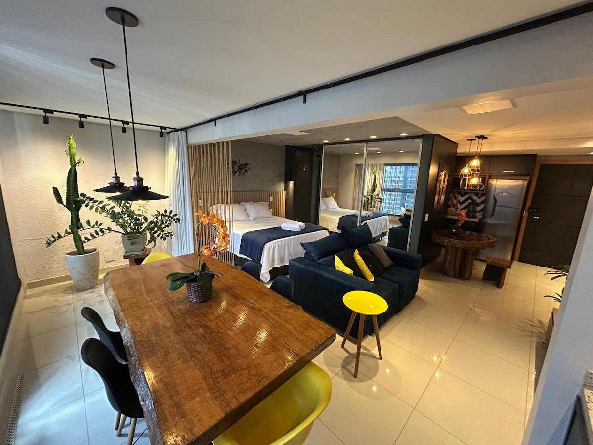 💯 Viva a experiência Marista Premium! Apartamento completo com quarto e sala separados, duas Smart TVs, Wi-Fi rápido e todo o conforto que você precisa para curtir Goiânia com estilo. Perfeito para viagens a trabalho ou lazer. Ligue o ar condicionado e a tv por comando de voz e escute suas músicas através da Alexa e desfrute do polo gastronômico do Setor Marista e o contemporâneo Setor Bueno na melhor região de Goiânia ! Condomínio Blend Smart Style Criação ®️Renovato Residences