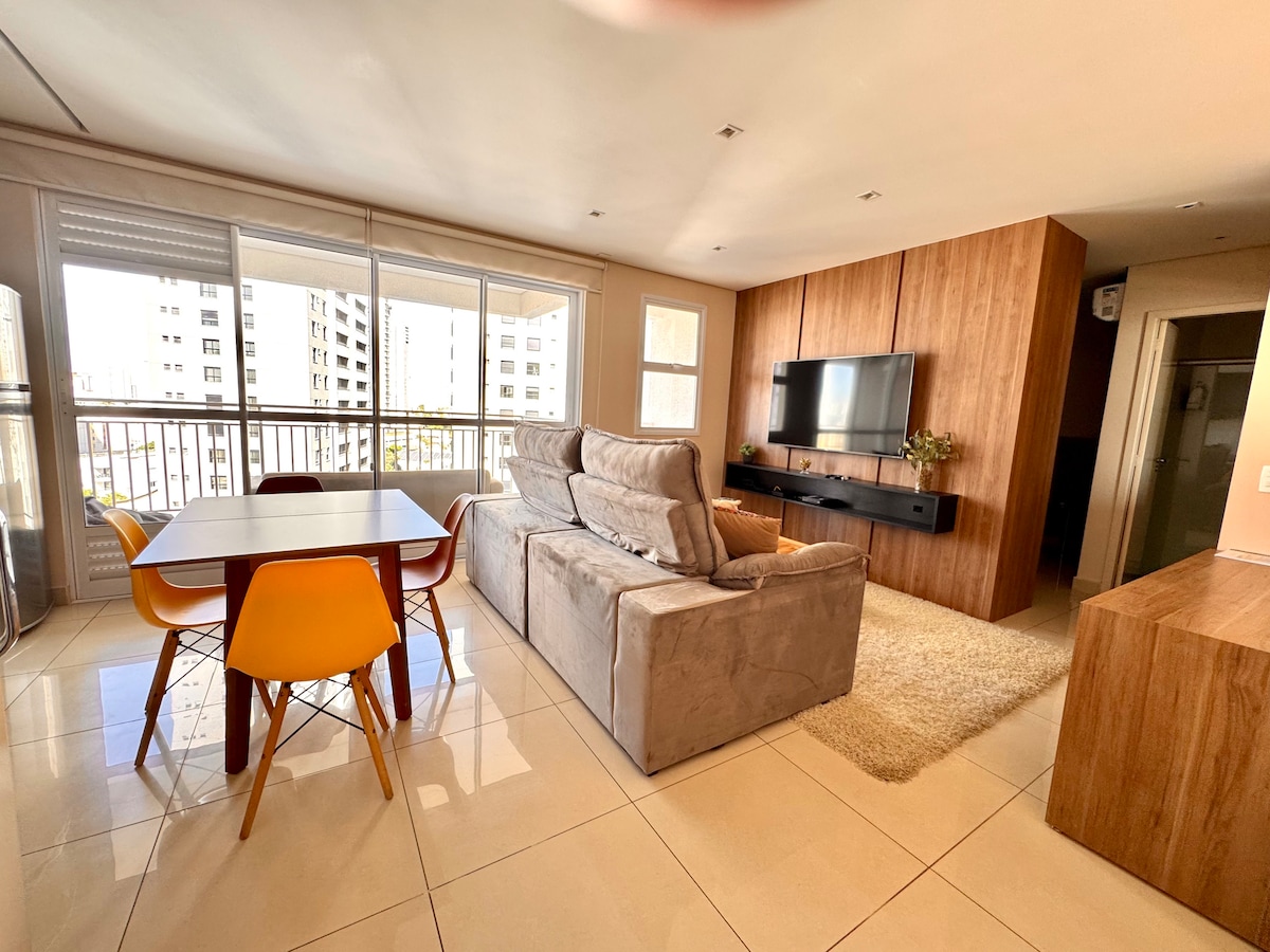 Apto 45 m2. Quarto:Cama Queen,armários,bancada escritório,TV 4K 50”,ar-cond.,roupa de cama/banho. Sala: sofá cama,TV 4K 50”,ar-cond.,mesa e 4 cadeiras design italiano. Cozinha:armários,bancada,cooktop 4 bocas,geladeira,forno elétrico,forno microonda,cafeteira elétrica,filtro água,sanduicheira, panelas,utensílios. Piscina borda infinita, hidro,sauna,academia,brinquedoteca,salão festa,espaços gourmet. 1 vaga garagem. Portaria 24 horas porteiro e segurança. Temos outro apto