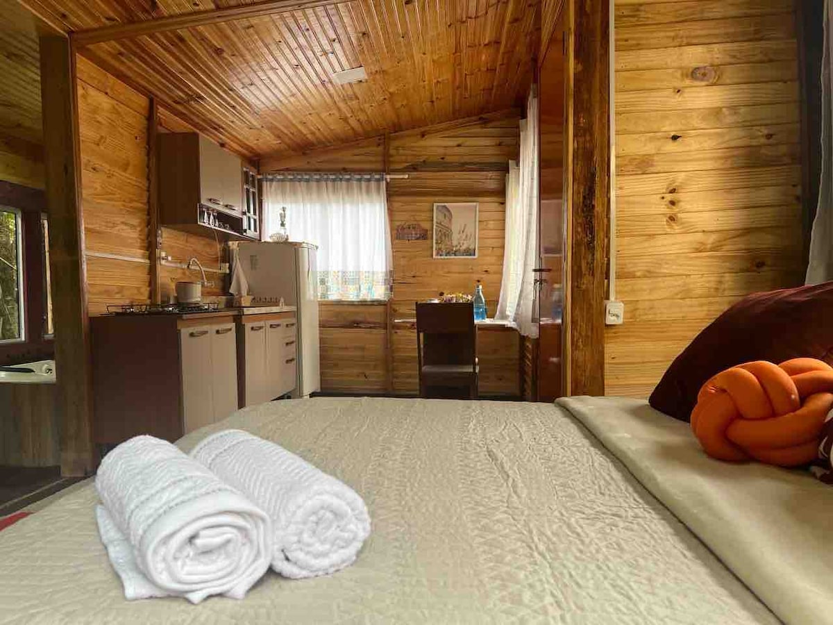 Relaxe neste espaço calmo e cheio de estilo. Um chalé bem diferente, tranquilo com hidro para você relaxar! Possui uma cozinha básica, churrasqueira a carvão (leve seu carvão para assar uma carninha). Cantinho da fogueira; Oferecemos roupa de cama limpa, 4 toalhas e disponibilizamos itens de limpeza (detergente e esponja para louças) e sabão líquido para as mãos no banheiro. Regras importantes: é proibido som automotivo ou qualquer outro ruído alto, tbm não pode fumar dentro do chalé!