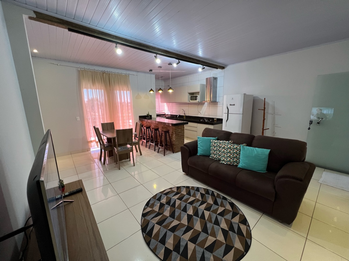 Privacidade e aconchego para morar e trabalhar remoto. Relaxe nesta acomodação muito bem equipada e com decoração super moderna. Apto dois quartos, cozinha e sala de estar completos. Com mesa e cadeira de escritório. Internet super rápida de fibra óptica com 300mb/s de velocidade. Possui uma vaga em garagem coberta com portão eletrônico.