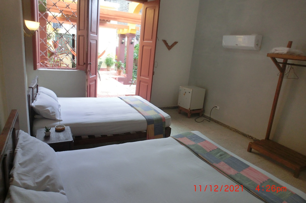 Esta habitación se ubica en primer nivel, frente al patio jardín, con fácil acceso, bien iluminada y ventilada. Un diseño sencillo que integra dos camas tamaño matrimonial y un baño privado dentro de la habitación. Esta en un área tranquila de la propiedad. Tenemos un generador eléctrico silencioso. Como alojamiento es excelente para familias y amigos. Existen perfectas condiciones para familias con niños.