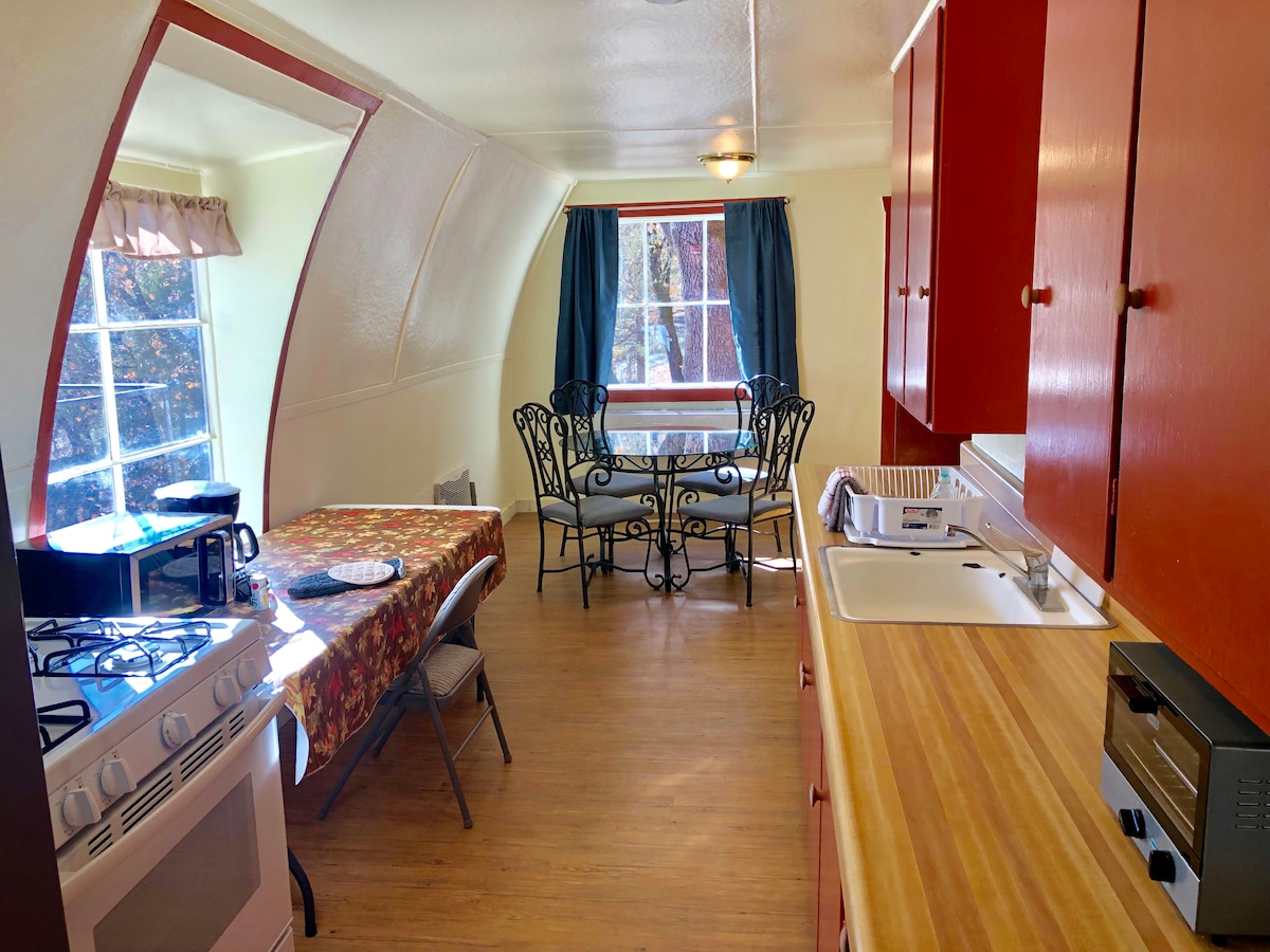 The Pine Cone Cottage is one of three separate cottages at River Rock Gardens. It features a king bed with a wonderful view of a small garden and the river beyond through French doors. It has a small bathroom w/shower. The kitchen area has a microwave, Keurig coffee maker, toaster and small refrigerator. The kitchen is NOT set up for any kind of major cooking - plan accordingly. We do have wildlife/security cameras on the property. None that violate your privacy.