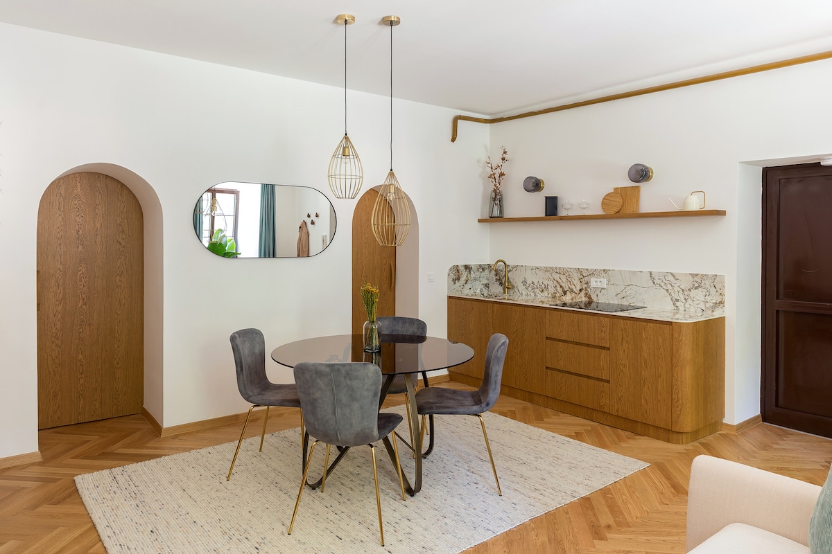 Our penthouse apartment, nestled beneath the iconic Ljubljana Castle, is a harmonious blend of history and modern luxury. This architectural gem is located within a cultural monument that offers an oasis in the city center, a quiet area, with stylish furnishings where history and modernity harmoniously coexist. You're just steps away from major attractions (marketplace, Funicular, Dragon Bridge...main bus&train station). Best location in town, at the crossroads of Ljubljana's cultural tapestry.