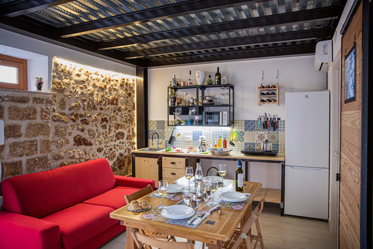 Anticamente la casa era il laboratorio di un fabbro con la sua piccola abitazione adiacente. Ristrutturata di recente in chiave contemporanea è diventata una residenza su due piani di circa 80 mq. Al piano terra si trova la zona living con il tavolo da pranzo, la cucina, i servizi ed una dispensa per i vini, raggiungibile da una scaletta in legno a gradini sfalsati. Una seconda scala in ferro nero, conduce al soppalco intermedio dove è organizzato lo studio. La balaustra diventa il piano di lavoro e si affaccia dalla doppia altezza. Al primo piano si trovano le due camere da letto con bagno interno. I pavimenti sono in cemento resinato e parte con mattonelle in pastina di cemento di recupero; il piano superiore è rifinito con parquet. Particolari gli arredi vintage, l'illuminazione degli ambienti e i quadri di arte contemporanea di un giovane artista-designer siciliano. La casa è dotata di climatizzazione invernale ed estiva, connessione wifi, Tv e lavastoviglie. A pochi chilometri c'è la spiaggia di Porto Palo (Bandiera Blu) con possibilità di gite in barca, voli con ultraleggeri e affitto bici. Nei dintorni, a meno di 25 minuti di auto, si può giocare a golf nello splendido Golf Verdura Resort. Sono facilmente raggiungibili i siti archeologici più importanti di Sicilia: Selinunte (15 minuti), Cave di Cusa (25 minuti), Segesta (45 minuti), Eraclea Minoa (40 minuti) e Agrigento e "Scala dei Turchi" (50 minuti) Da visitare: la città di Sciacca, Sambuca di Sicilia (Borgo più bello d'Italia 2016), il Parco Letterario di Tomasi di Lampedusa a Santa Margherita (15 minuti), il “cretto di Burri" a Gibellina (30 minuti), lo Stagnone di Marsala (Mothia), le Saline e la città di Trapani, Erice (tutti a circa 60 minuti di auto) La città è ben collegata con gli aereoporti Falcone Borsellino di Palermo e Trapani Birgi entrambi raggiungibili in un'ora di auto.