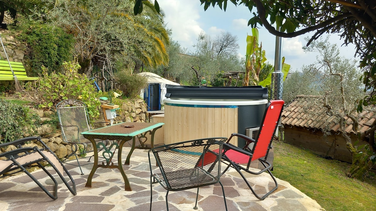 A cottage made up of stone and timber built on two storeys, with a large living room, glass window, a couch for two people and a bathroom with sauna; on the second storey there is a double bedroom. Outdoors, there is a large garden with a porch equipped with BBQ and a wooden table. The site is located on the pleasant hills between Bellegra and Olevano Romano. We have currently added two beds, set up in a wonderful Indian teepe available for two extra guests in addition to the four ones.