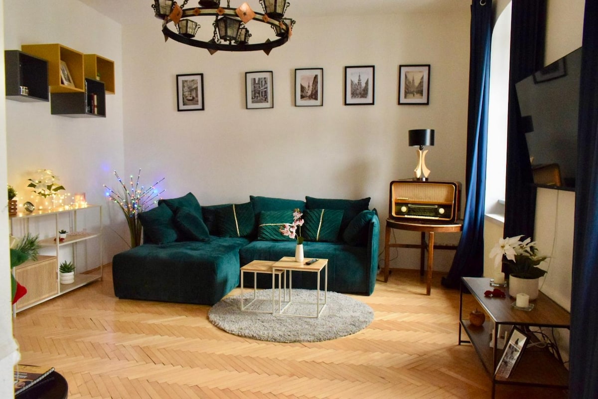 The apartment is only 15 -20 minutes' walk from the historical city center and faces the new Nivy Mall Bus Station. Surrounded by vibrant places, restaurants and cafes, this cozy apartment, which also overlooks a small public garden, will nonetheless give you a chance to enjoy a little quiet. With two separate bedrooms and a large living room, this place is ideal for couples or families with children. In addition, you have access to Netflix, Amazon Prime and Nespresso machine.