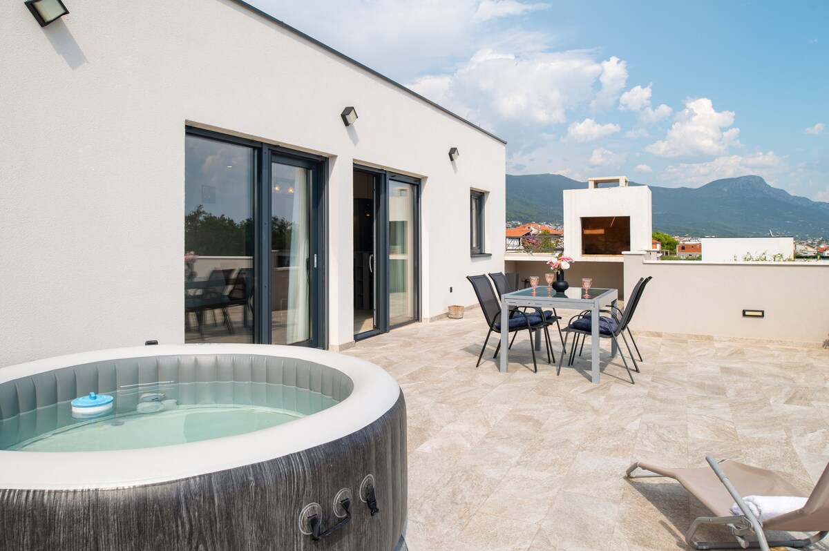 Apartment is located in quiet and exclusive residential neighborhood Zenta, in a small building on the third, last floor. Building is on the cost line overlooking marina, beaches and surrounding islands. It offers a a big 100 m2 furnished balcony with Jacuzzi Hot tub. The UNESCO-protected Diocletian's Palace is about 2,5 km away.