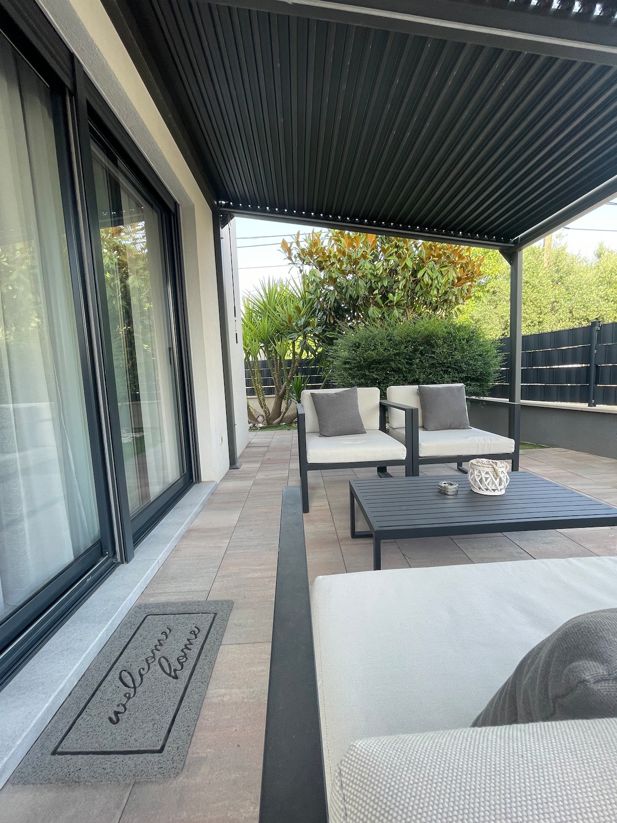 Newly built luxury house, consists of five bedrooms, five bathrooms, one toilet, kitchen, living room, sauna, exercise area, terrace, yard with heated pool and jacuzzi. The villa is located near the beach, with a beautiful view of the sea and islands from the terrace Ideal for families, groups of friends ****Heated pool *** ****Sauna *** ****Jacuzzi *** ****Gym***