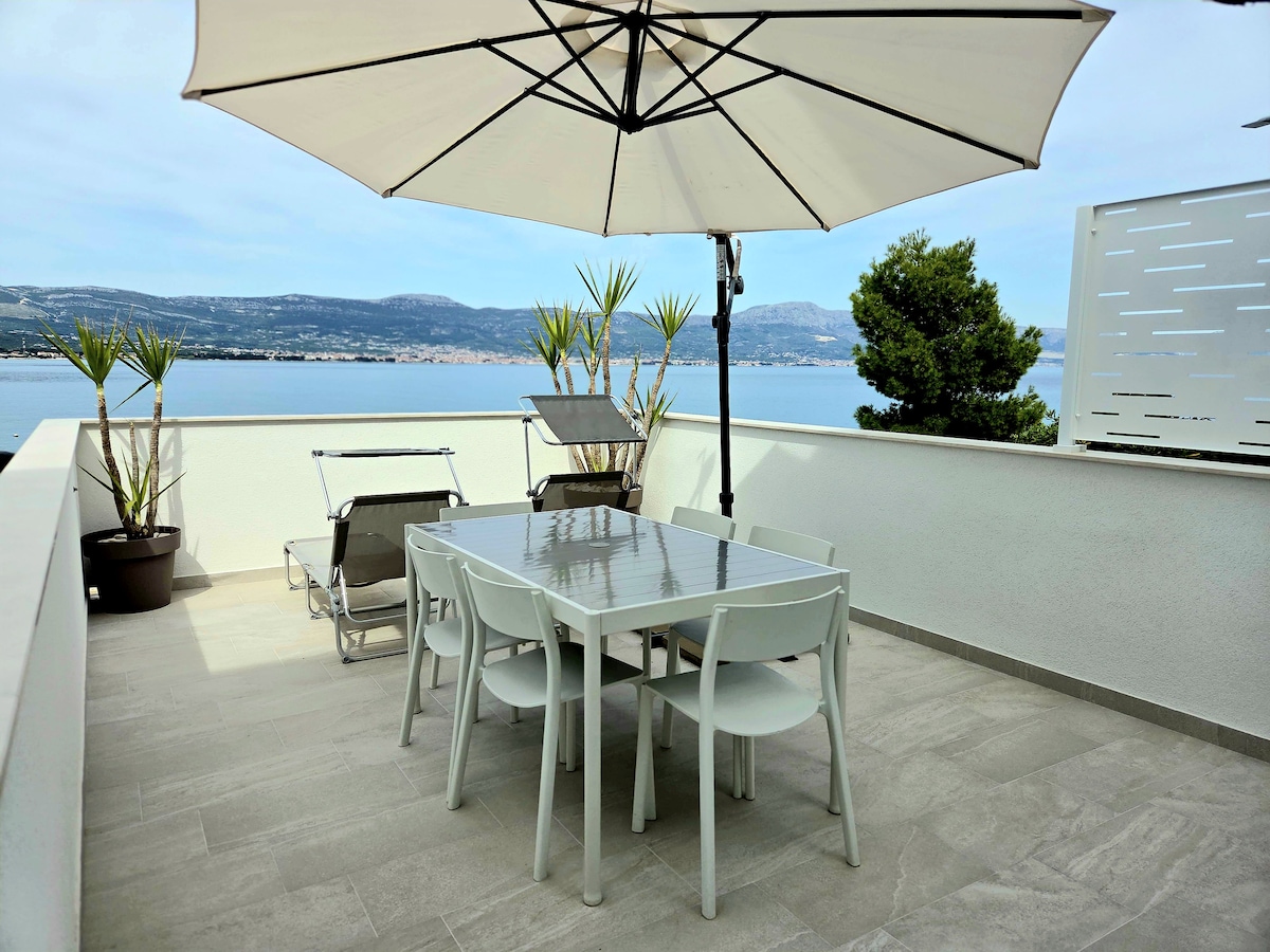 The apartment was newly built, 2021.The apartment is in a block,connected to a family house.. It has two floors with a separate entrance. Guests can use a part of the garden in front of the apartment with a table and chairs. Atractive beach with plenty things to do is 2 minutes . The apartment you can enjoy and relax, and if you want any other activity ,its near by .Trogir is a 15 minute walk and there is a boat every 10 minutes .Enjoy the sun and the Adriatic sea in an attractive location ''.